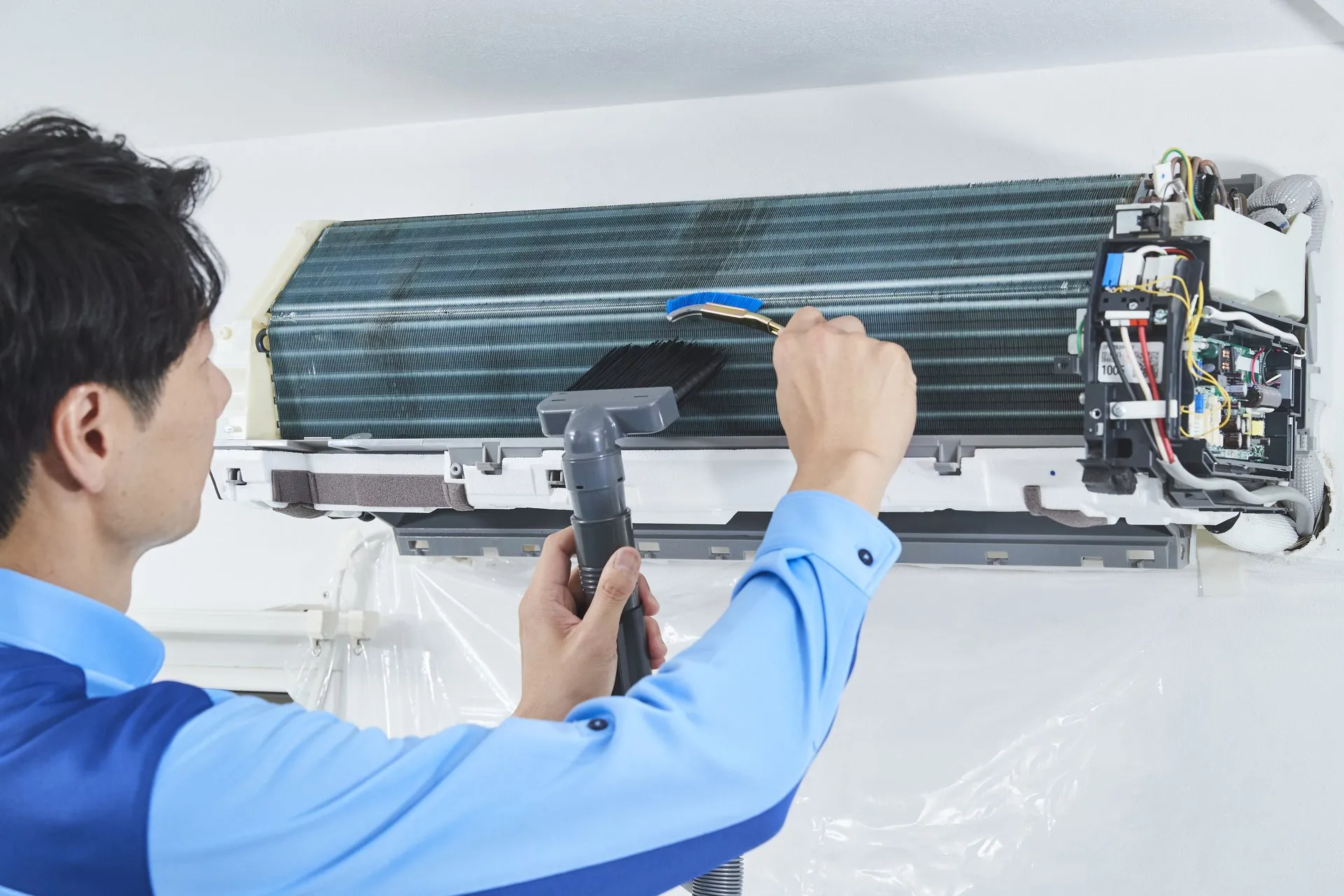エアコン内部に溜まったホコリを、バキュームを使用して丁寧に除去します。